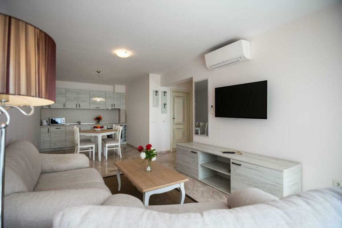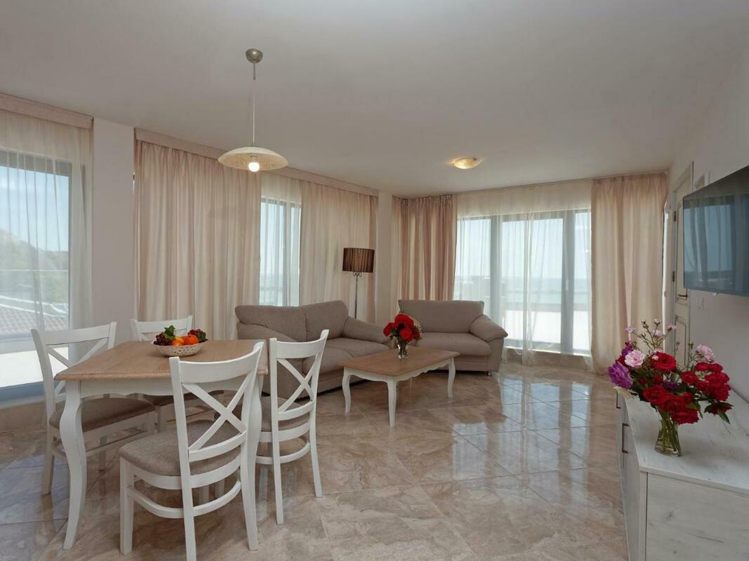5 Apartment one bedroom sea view of about 50 sq.m, (max.2+2/3+0), the bedroom and the hall with the kitchen are separated by a door. Kitchenette: ceramic hob, oven, microwave, dishwasher, dishes, pots and cutlery, dining table and chairs. Air conditioning, flat screen TV, Wi-Fi, sauna with shower/WC. Only some of the apartments have a balcony.